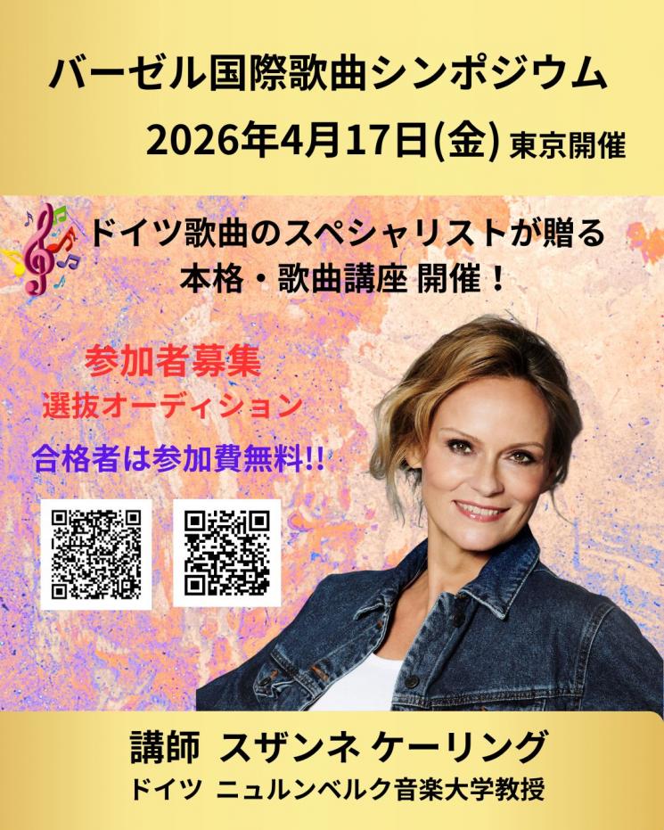 バーゼル国際歌曲コンクール 世界歌曲大会開催に合わせ、本選会前日に ニュルンベルク音楽大学 スザンネ・ケーリング教授 による ドイツ歌曲の特別講座 を開催いたします。ドイツ歌曲のスペシャリストによる貴重な学びの機会、本場の音の響きを是非体験ください。皆さまのご応募を心よりお待ちしております。
