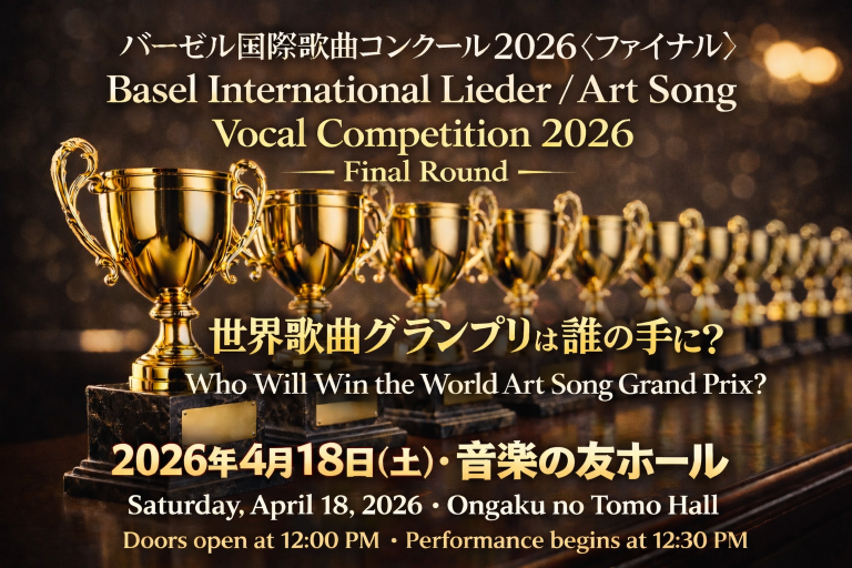 日本初開催・世界歌曲コンクールバーゼル国際歌曲コンクール2026 ファイナルBasel International Lieder / Art Song Vocal Competition 2026“世界一の歌曲グランプリ”の栄冠は、誰の手に――。Who will claim the crown of the world’s most prestigious Art Song Grand Prix?今回新たに、バーゼル国際歌曲聴衆賞も設置。 2026年4月18日(土) 音楽の友ホール ONGAKU NO TOMO HALL, Tokyo,Japan 12:00開場 12:30開演 電子チケット ←クリック 紙チケットをご希望の方は弊社事務局へお問合せをお願い致します。 Admission (All Seats Unreserved) • Advance: ¥3,700 (Limited to 100 seats) • At the Door: ¥4,000 E- Ticket reservation ← クリック |