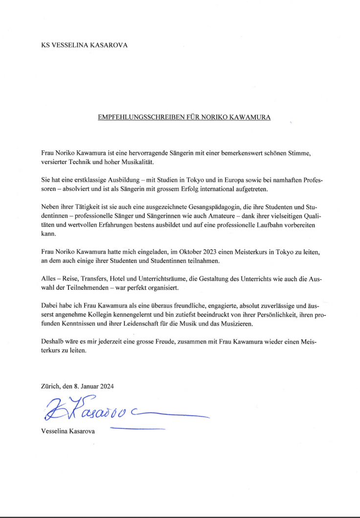 She has experience as a jury member through various competitions like International Rumania Music Competition in 2019, Bel Canto Singing Competition in 2021, 2022. In 2021, under the official approval of the Embassy of Switzerland in Japan, the Basel International Vocal Competition was founded, and since then it has hosted many successful online competitions with entries from 25 countries around the world. Since then, She has also produced piano, violin, harp, and flute competitions, contributing to global music education. In 2022, she successfully interpreted for the world-famous mezzo-soprano Vesselina Kasarova’s masterclass in Nagoya. In October 2023, she orgnized Kasarova’s masterclass in Tokyo. She is especially active as International vocal coach. As a specialist in breathing and vocal techniques, her teaching methods supports all instruments. She is also active as a German interpreter in the field of vocal music. She is trusted by international musicians and she regularly invites European and Asian musicians to Japan.